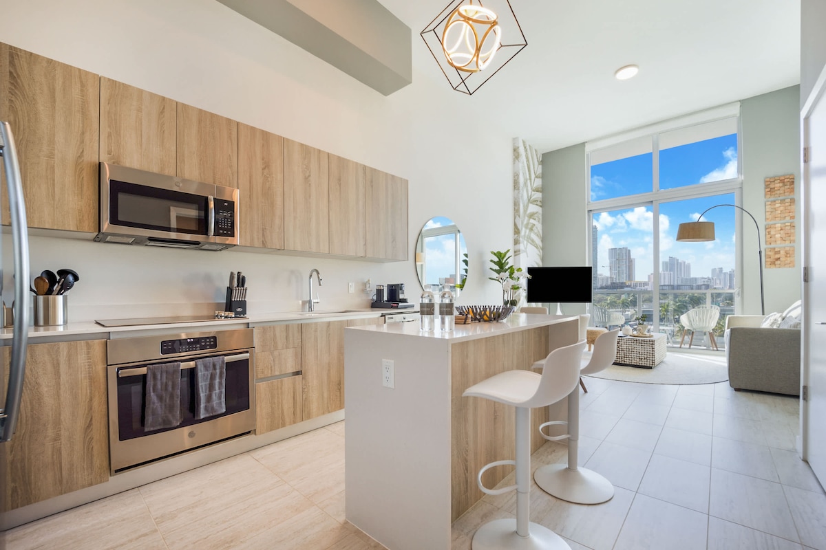 New Condo, inside a modern hotel tower, enjoy the hotel-like amenities: pool, jacuzzi, (14th floor), gym, restaurant, grab & go coffee shop, bar, co-working, valet parking for a fee. One bedroom apartment, bathroom, full kitchen, living and dining areas, tv, wi-fi, washer, dryer. Close distance to Miami lively neighborhoods: Brickell, Coconut Grove, Design District, Wynwood, Miami/South Beach. Prime location, Malls: Bayside, Brickell Centre, Venues: Bayfront, FTX, Arsht Center, Museums: Frost