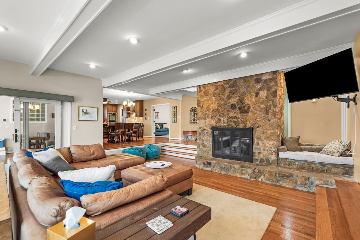 1960s ranch style home on 2 acres with 2,400ft² interior. This home has been fully remodeled with a large open floor plan and all modern amenities and decor. With ample yard and patio space, large bedrooms, bonus room and 3 full bathrooms there is plenty of space to spread out. • Abundant Natural Lighting • Backyard w/ patio + fire pit + hammocks • Comfy Beds • Fully stocked Chefs Kitchen • Large Private Deck + BBQ grill • Indoor fireplace • 400Mps WiFi • 3 x 4K TVs w/ Disney, Netflix & Prime