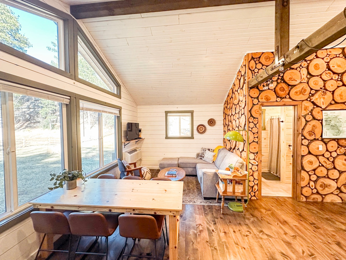 The Winsome Cabin is part of Hinterwood Inn & Cabins, situated 60 ft. from National Forest. Enjoy hiking and wildlife sightings from your front door! The cabin has 2 bedrooms, each with a queen bed, a queen murphy bed in the living room, a bathroom with a shower (no tub), and an apartment size kitchen w/ essentials. Custom built by the owners, enjoy the beautiful stump accent wall, vaulted ceilings, and large windows. Includes a private deck with a gas grill, private fire pit area, and more!