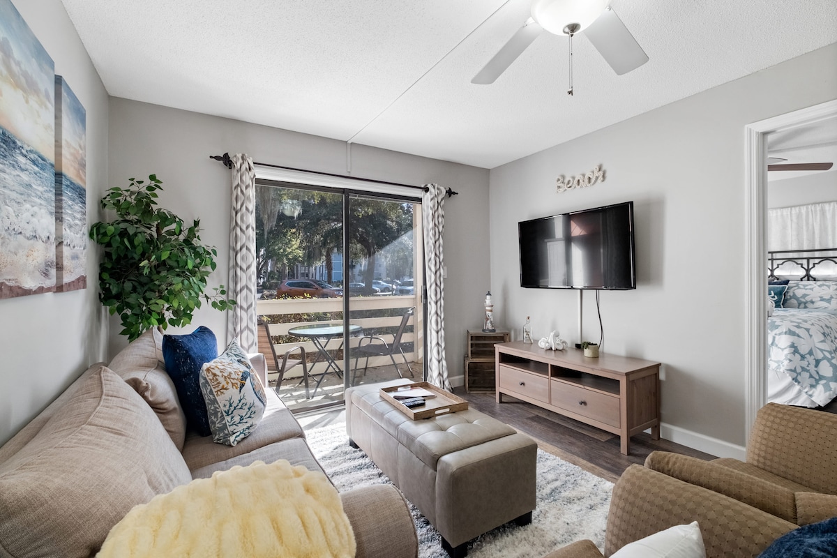 Located in Hilton Head Beach & Tennis Resort on the first floor. Extremely short walk to the beach. The gated resort features 2 pools, 3 restaurant's, tennis courts, & a playground. Condo is newly updated featuring an open layout to include dining room, fully equipped kitchen and two bedrooms (Queen bed,2 twin beds, and one rolling folding bed with mattress). All TVs are smart TVs & feature cable. - Largest oceanfront pool on island - Beach Bar - Restaurant & Sports Bar - Pickleball