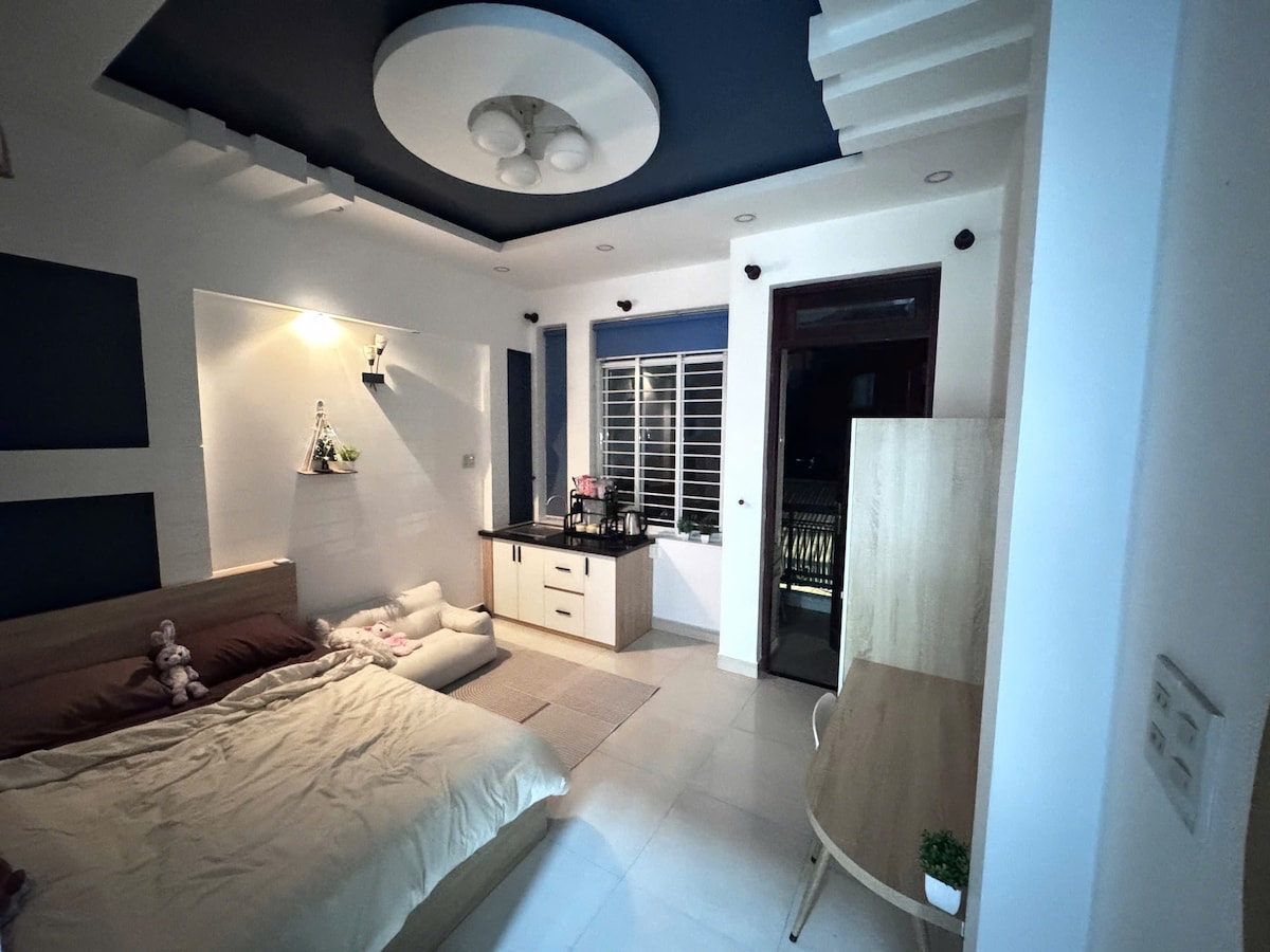 Căn hộ hiện đại, ấm cúng với thiết kế tối giản và đầy đủ tiện nghi (1 trệt và 1 lầu). Phòng khách với sofa đỏ nổi bật, bàn trà nhỏ xinh và TV, kết hợp với bếp gỗ sang trọng, đầy đủ dụng cụ nấu ăn, tủ lạnh và bếp điện. Khu vực ăn uống ấm áp với bàn ghế gỗ cho 4 người. 2 phòng ngủ rộng rãi, ánh sáng tự nhiên chan hòa, giường êm ái và máy chiếu tiện lợi để thư giãn. Đây là không gian lý tưởng cho kỳ nghỉ thoải mái, gần sân bay Tân Sân Nhất, phù hợp gia đình hoặc nhóm bạn.