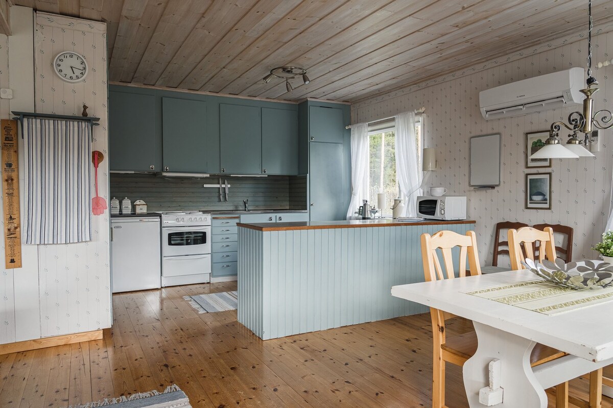 This charming cottage by the water is the perfect place to relax. Surrounded by beautiful nature and with a spectacular view of the sea, it offers a peaceful and tranquil retreat. Here you can enjoy quiet mornings by the water or watch colorful sunsets – a true oasis beyond the hectic pace of everyday life. The cottage is equipped with a sauna and a wood-burning stove, and for extra comfort there is a fridge/freezer and several heating elements, which makes it possible to visit this place all year round.
