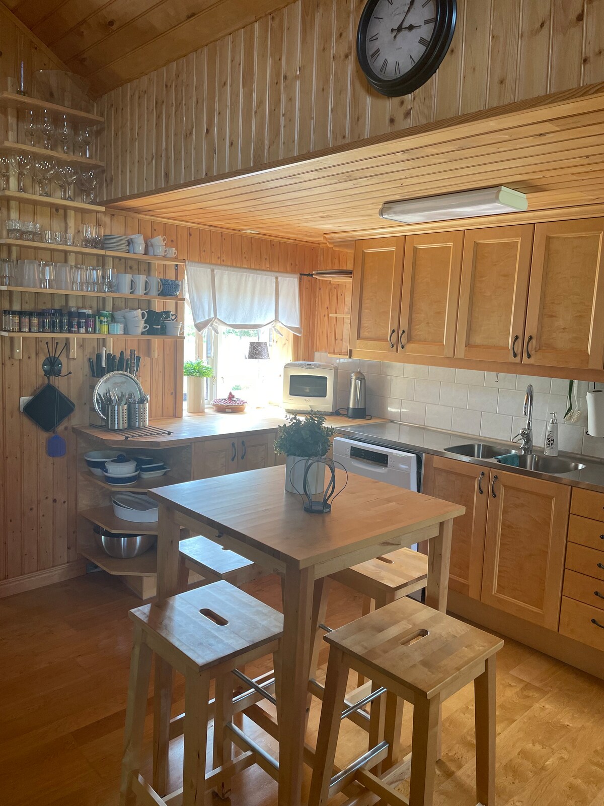 Cottage with lake property and its own beach and dock. 3 bedrooms, 1 room with a double bed, 2 rooms each with each a bunk bed, and a sofa bed for 2 people in the TV room. Shower and toilet with own well and water heater. NOTE, washing machine is missing. Guests needs to bring own bed linen and towels. Access to a hot bath (39 degrees Celsius) all year round with circulation for purification. Use of a rowboat is included, bring your own life jackets. The cabin is smoking-free and pet-free! ATTENTION, not for partying groups!
