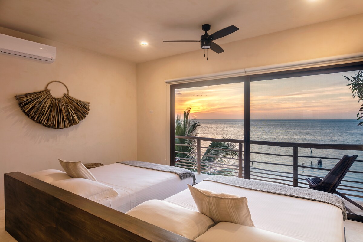 Spacious Villa with direct access to the turquoise water and the powder white sand of the Holbox beach. Featuring two bedrooms with a king size bed each, ceiling fans and air conditioning; plus a mezzanine with another king bed and an ocean view living room with a double sofa bed, for added sleeping spaces (no AC). Two full, private bathrooms with complimentary organic toiletries. Fully equipped kitchen, dining room and an amazing roof top terrace with sun loungers and a jetted tub.