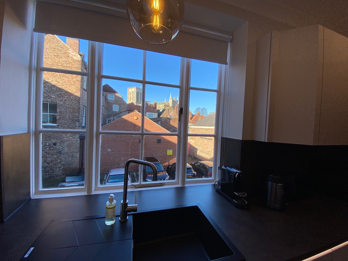 City centre ground floor apartment with views of the York walls. 5 minute walk to shops, attractions, coffee shops and restaurants. Free onsite parking. Newly refurbished and decorated throughout, double bedroom and very comfortable sofa bed in the living room. The stylish well equipped kitchen has an induction hob and oven. There is a smart TV and free Wi-Fi. The bathroom has a Bath and shower and toiletries for your stay. A travel cot is available on request.