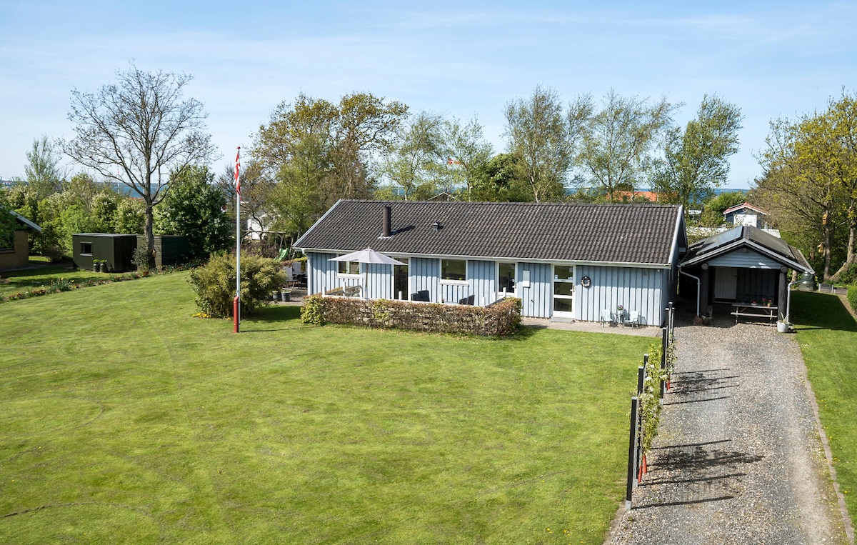 Relax in this unique and scenic cottage with panoramic views of the water, Toftum Bjerge and the small harbor in Remmerstrand. The different ceiling heights and intimate spaces create a charming and cozy atmosphere in the old fisherman's house. Towards the water, there is an orangery/sun room and a terrace with a private path directly down to the beach. The house also has a covered terrace with outdoor kitchen, where you can cook your dinner on the grill or enjoy the sunset in the evening.