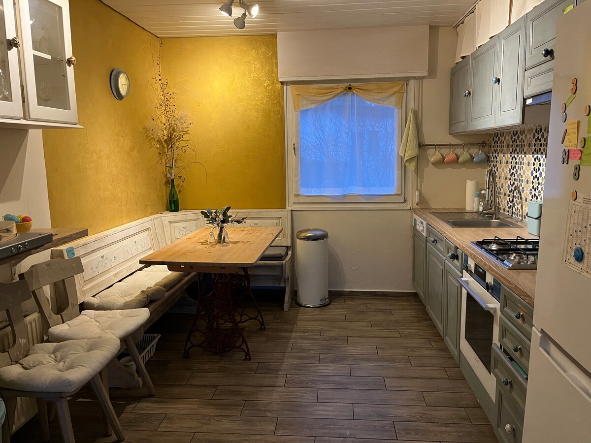 Homemade Apartment is far away from noisy cities. No matter if you are travelling for business or simply taking few days off with your family - you will find here peace, tranquillity and possibly to get really close to the nature, . Build in 2022 holiday apartment, has fully equipped kitchen, beautifully designed living room, en-suite bedroom and a gallery (max. gallery hight 1.7m). Our garden is still under construction but there is a direct access to fields and forests.