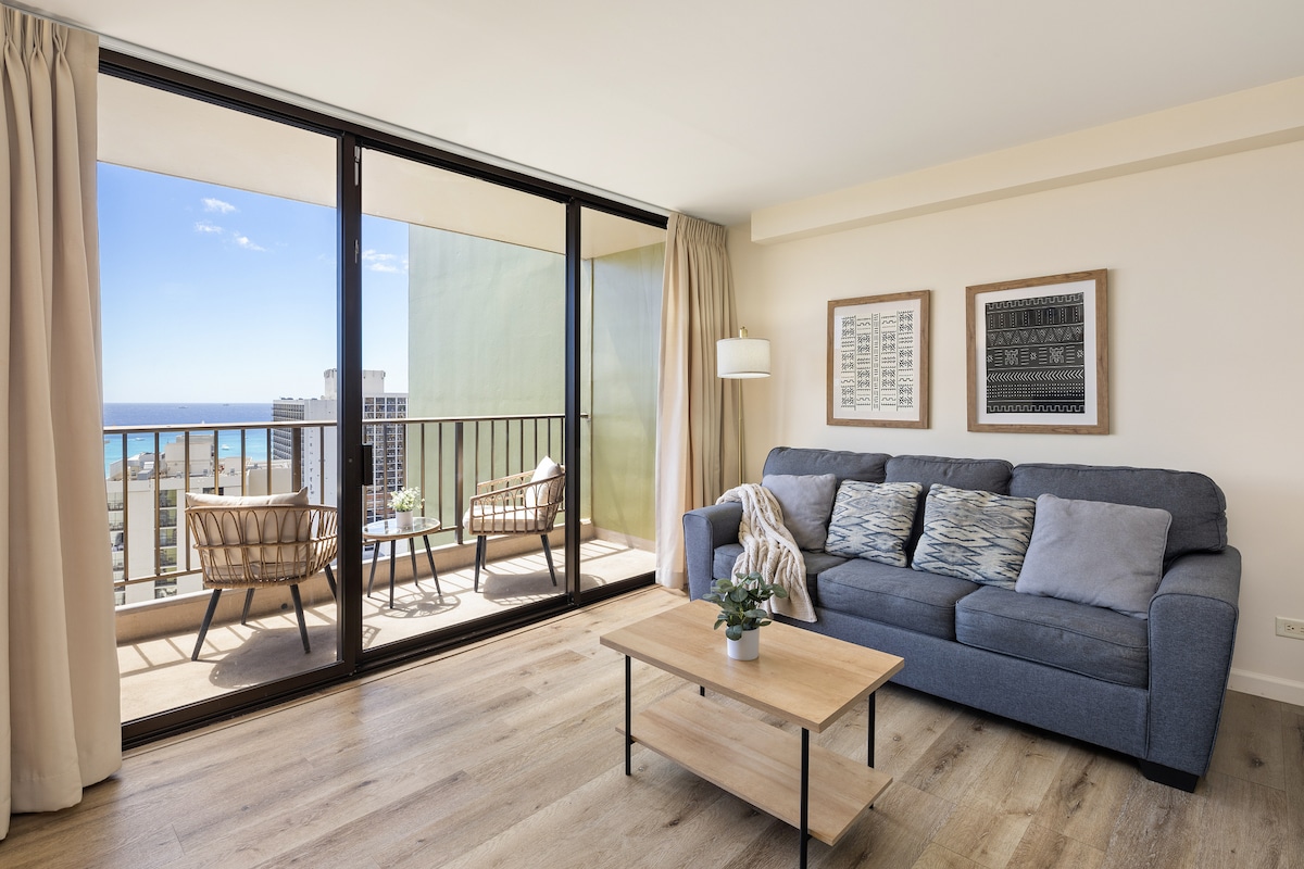 Newly renovated 1-bedroom with stunning panoramic ocean views! Enjoy an open concept layout with a king bed, full-size appliances, and a sofa bed in the living room. Features include central AC, fast WiFi, TVs in both rooms, and a large pocket door for privacy. A Juliet balcony to take in the ocean view including the Friday night fireworks. Walk to Ala Moana Mall, Hilton Hotel, and Duke’s Lagoon plus more Garage parking available for $33 a night 24/7 security, laundry room in building