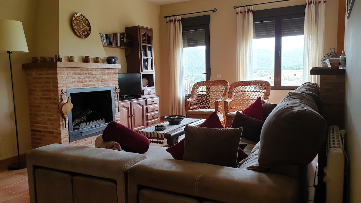 A stone and wood house in the middle of the mountains, 3 bedrooms with a 150cm bed, a sofa bed, sleeps up to 7 people, equipped kitchen, 1 bathroom, TV, Wi-Fi, air conditioning, wood stove.... The pool is private for guest use and is open from the end of May until autumn, when the rains begin. Private outdoor garden with barbecue It is an old tobacco and paprika dryer restored in a comfortable, cozy, rustic space with a modern twist