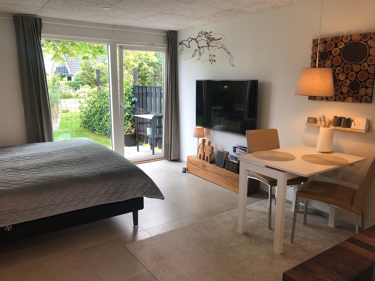 Cozy guesthouse centrally located in Voerså. 150 meters to the supermarket 150 meters to a large playground 150 meters to sports and multi-purpose court 450 meters to Voer Å with kayak and canoe 500 meters to Riverside restaurant & pizzeria The home has a private entrance and private bathroom/toilet and kitchenette. Extra bedding is available for 3 people in total. On rainy days, you can enjoy a movie atmosphere on the screen. The price includes linen, cleaning and light breakfast. The guest house is 22 m2, see pictures of the decor