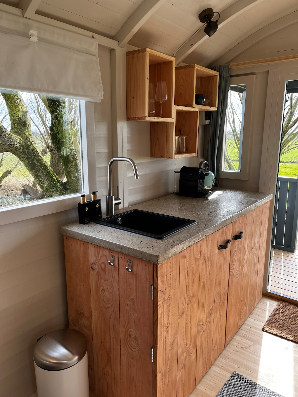 Welcome to our unique tiny house, hidden in a private forest on the outskirts of the charming Frisian village of Noordwolde. This modern accommodation is ideal for peace seekers and nature lovers. In the summer, enjoy your spacious private garden with seating area, a veranda and a hammock among the trees. In winter, you can sit comfortably inside by the wood-burning stove, which heats the room in no time. The tiny house is compact but equipped with every comfort!