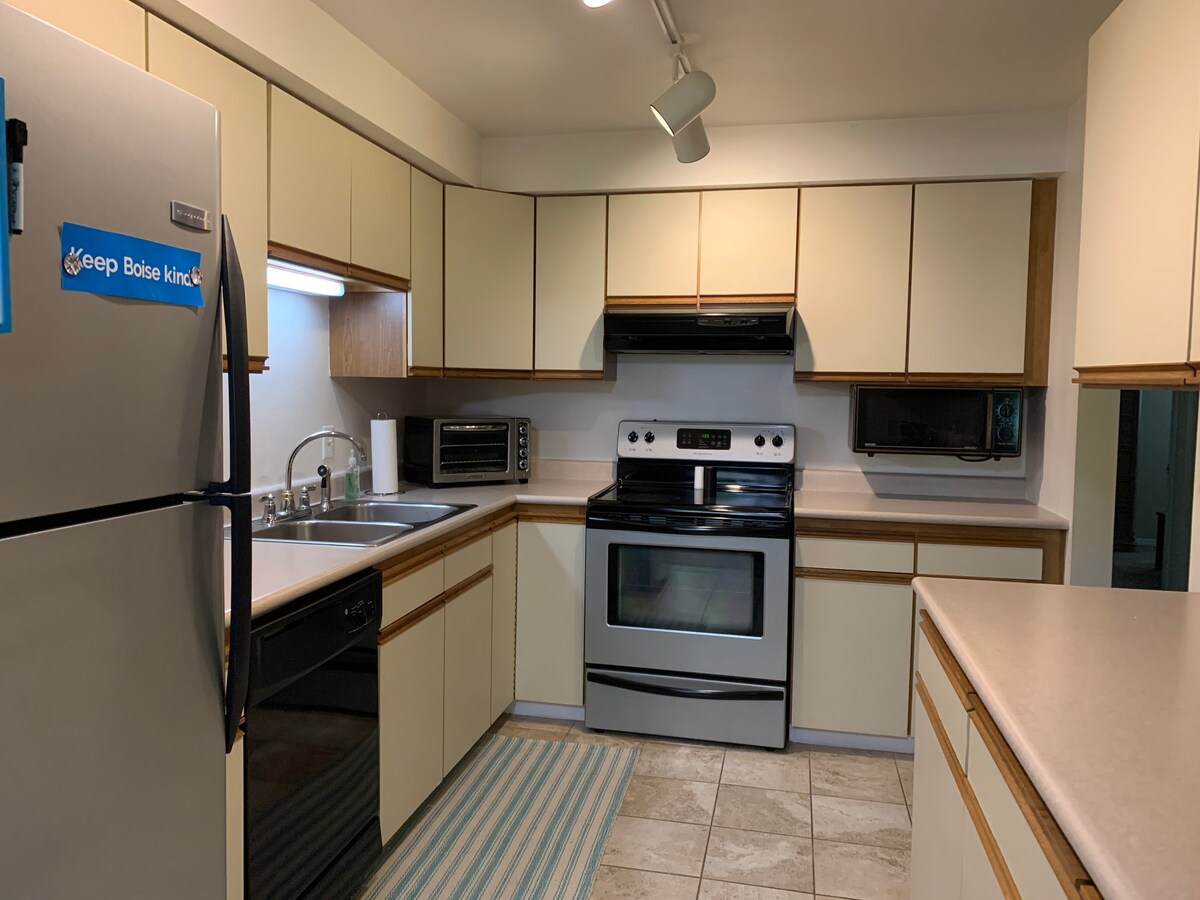 Clean and cozy 2nd level 800 sq ft condo in a prime location within proximity to BSU, downtown, the Greenbelt, Bown Crossing, Simplot Soccer Fields, the airport & more. Backs up to a peaceful pond with a fountain. Enjoy access to clubhouse amenities including pool, hot tub, sauna, fitness center & rec room. Ideal for convenient, low-maintenance living in in South East Boise. There's one bedroom with a Queen bed, and a portable Queen sized tri-fold mattress for the living room.