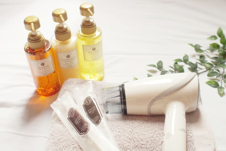 Bath towel/hair dryer/toothbrush/shampoo/conditioner/body soap