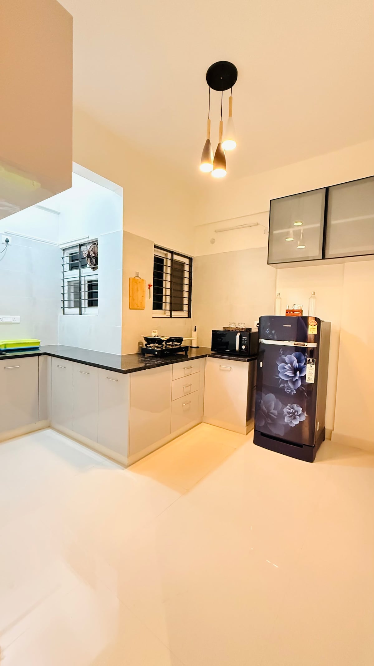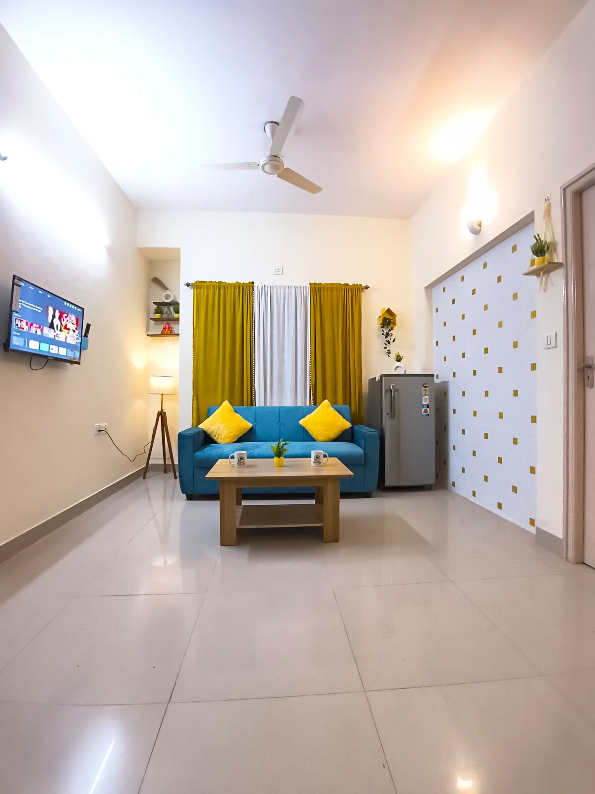 Enjoy a cozy, couple-friendly 1BHK designed for comfort and relaxation. The space features a queen-size bed, a well-lit hall and bedroom with a refreshing cool breeze, and a private balcony to unwind. Equipped with a 55-inch TV, fridge, washing machine, and basic cooking vessels, it’s perfect for both short and long stays. AC add-on, charged separately. A peaceful, homely retreat where you can relax, recharge, and feel at ease. Ideal for travellers and working professionals seeking comfort.