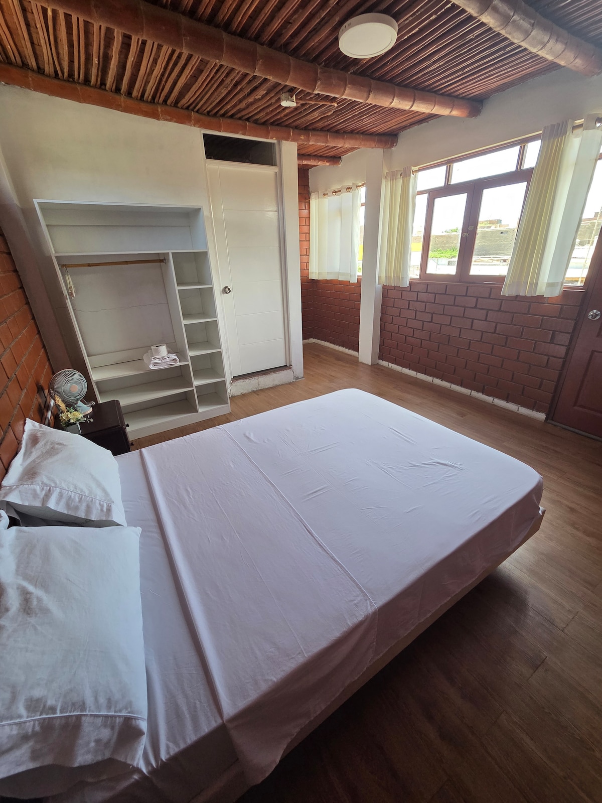 Mini-apartment located in Huarmey, minutes from the Tuquillo Spa. It has 3 beds (1 queen size bed and a cabin with 1 double bed downstairs and 1.5 beds upstairs), open kitchen, bathroom, dining room and backyard. With independent entrance and internal garage (subject to availability). The Accommodation also has other single, double and queen rooms (on request).