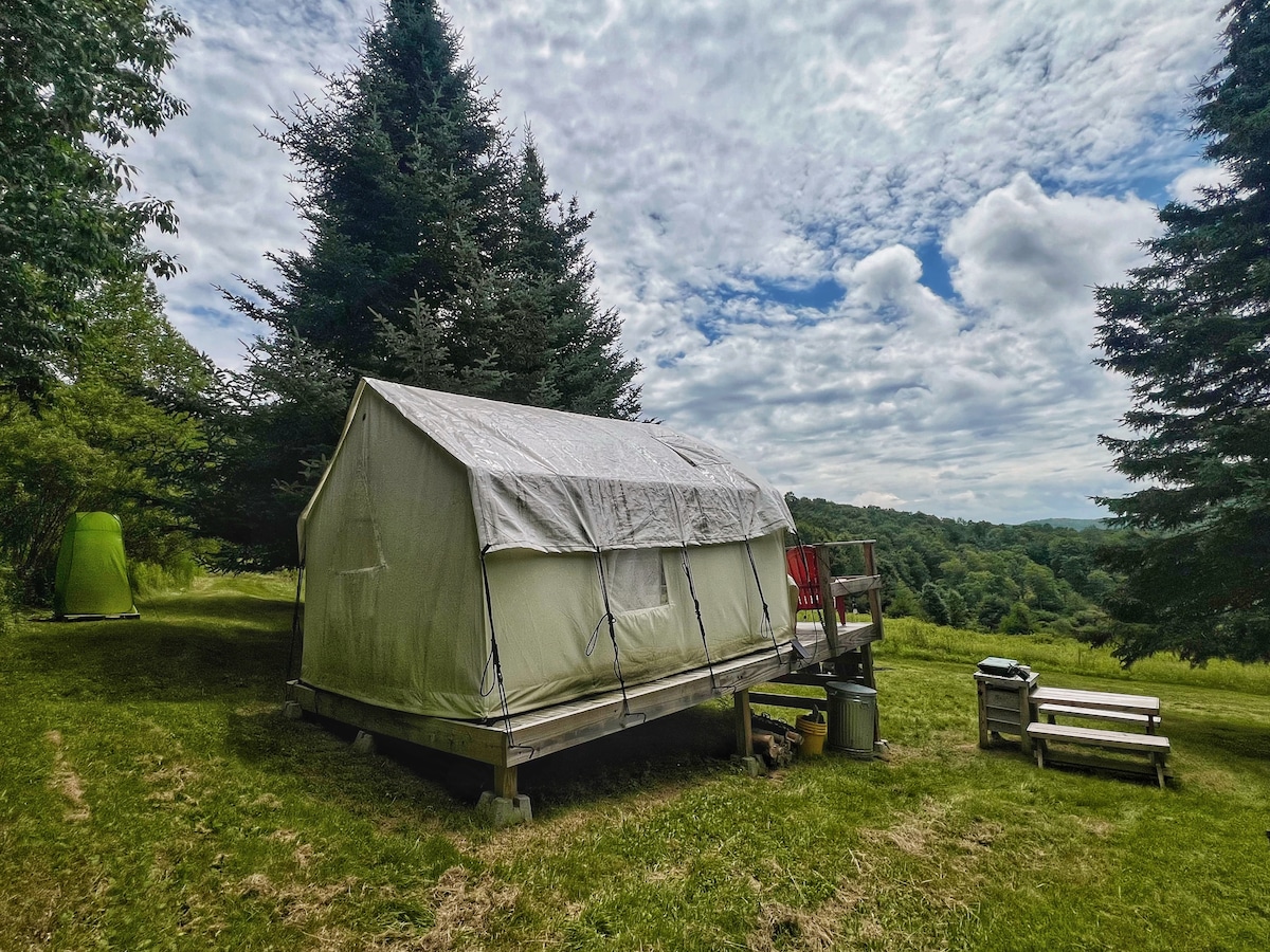 Our off-grid canvas tent is situated at the edge of a meadow, surrounded by blueberry bushes. It's just 4.5 miles to Main St in Livingston Manor, and 35 minutes to Bethel Woods. We provide a full-size bed (w/ heated mattress pad), fire pit, firewood, propane heater, and solar power. You have access to a private outhouse with composting toilet & outdoor shower on-site, and a conventional shared bathroom if you preferred. We are an LGBTQ+ inclusive space.