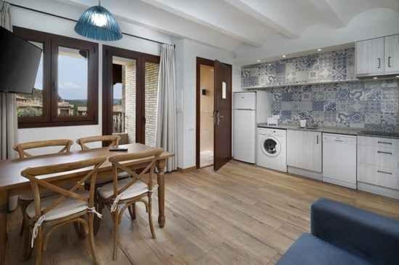 Apartment with outdoor terrace. -Common area with pool and barbecue -Magnificent views of the castle of Alquezar. It has 1 rooms with a double bed and another room with 2 single beds, 1 bathrooms, a full kitchen and the possibility of a sofa bed in the living room.