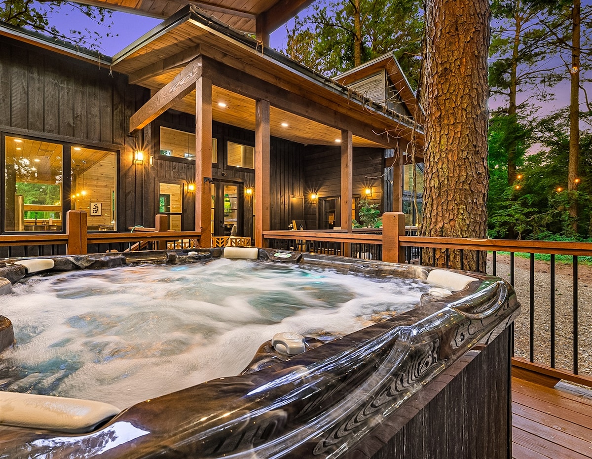 Introducing The Onyx Escape in Broken Bow Oklahoma! A true Honeymoon cabin experience. Discover the unparalleled serenity, nestled amidst the picturesque Ouachita National Forest. This spacious 1100 square ft. cabin boasts contemporary design and luxurious amenities to ensure your utmost relaxation and rejuvenation. The cabin showcases a vast outdoor living space surrounded by towering pine trees. Soak in the hot tub or cozy up by the fire while taking in the nature that surrounds you.