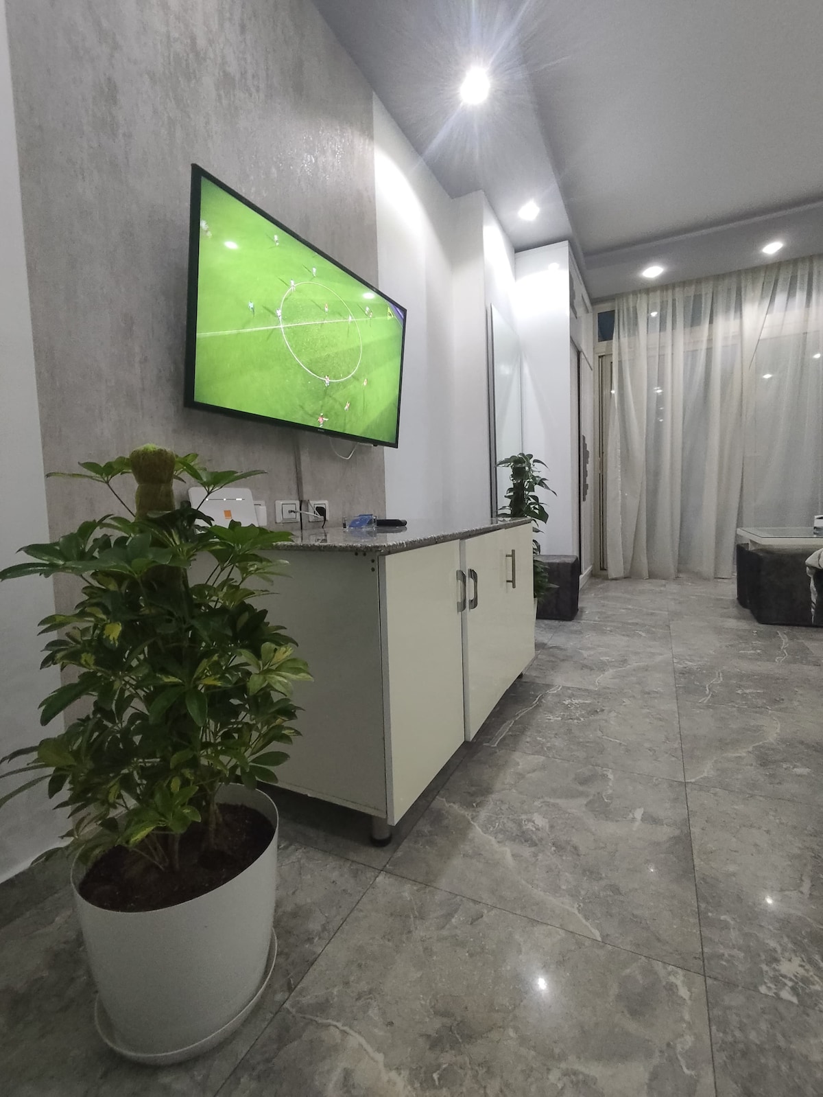 Enjoy a unique stay in our stylish ground floor apartment with a great view of the garden and pool. The apartment consists of a comfortable bedroom and a spacious living room with an open kitchen, as well as a stylish bathroom and a spacious terrace that allows you to relax in a quiet atmosphere. What distinguishes our home is its unique location within a quiet residential complex, where you can easily access a mall just 20 steps from the apartment, with a variety of restaurants and cafes. Also, the place is just 10 minutes away from the airport, making it ideal for travelers looking for comfort.