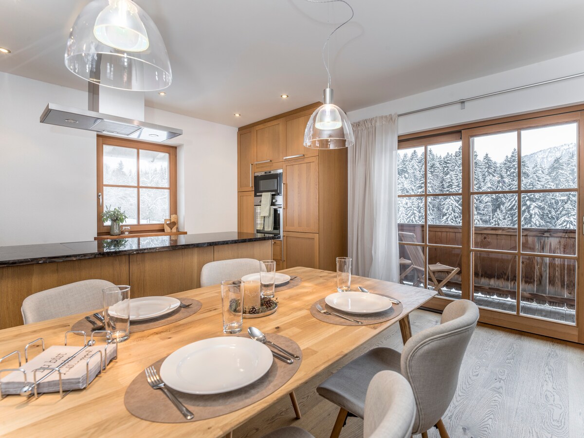 Elegant penthouse apartment in modern alpine style on the Seefelder plateau. The cozy, quiet apartment on the last floor is designed for up to 4 people very comfortably. It has a bright living-dining area with modern fully equipped kitchen, two double bedrooms, two bathrooms, underfloor heating, free Wi-Fi and a very large private terrace. From there you can enjoy the breathtaking view of the mountains and the Inn Valley, both in summer and in winter.