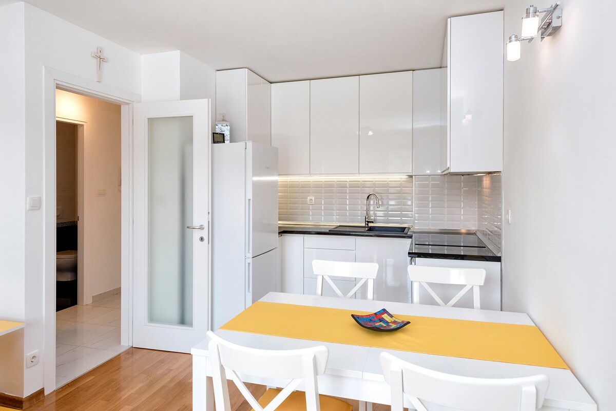 Brand new modern and stylish apartment centrally located, close to the beach, and with a beautiful view. This spacious (90 m2) modern flat consisting of two bedrooms, two bathrooms, a huge, open plan kitchen with the living room area, and the terrace is fully equipped for a very comfortable stay. Just a few minutes walking distances to the main square but still situated in a quiet neighborhood.