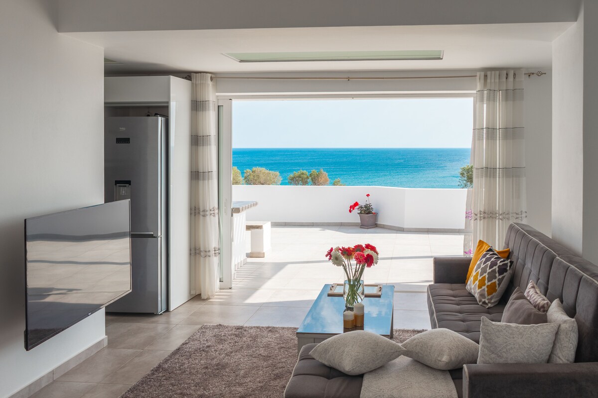 We welcome you to Endless Blue, our brand new 100m2 apartment suitable to comfortably accommodate up to five people. It consists of two large bedrooms, each with a king-size bed, a fully equipped kitchen finished to very high standards, and a spacious living room with an astonishing view to the sea. The Mediterranean Sea can almost be touched from our 80m2 balcony where you can enjoy the Cretan sun on the sunbeds or your meals under the pergola.