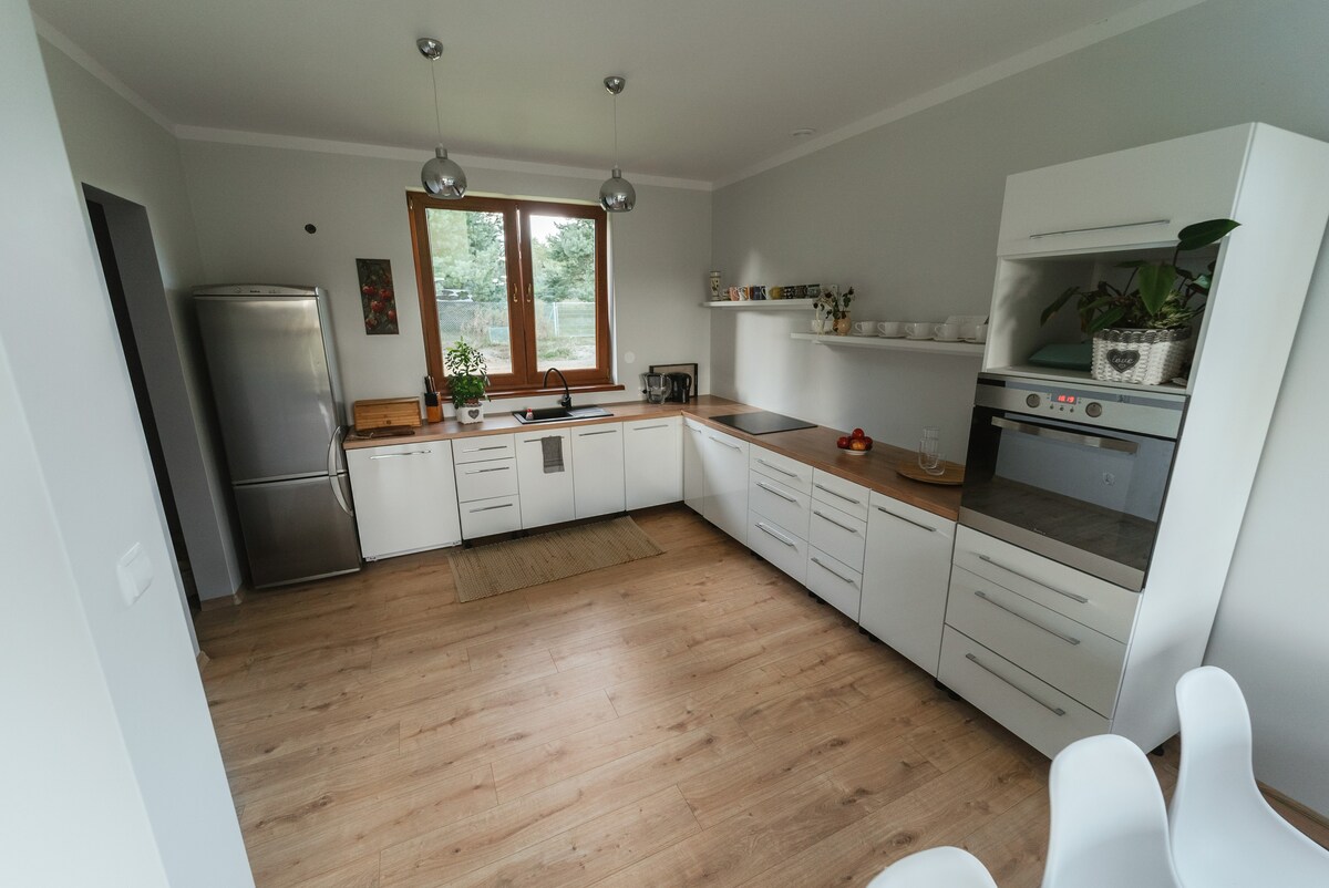 In our house, we offer our guests a haven of relaxation and tranquility, where you can break away from the hustle and bustle of the city and enjoy contact with nature. There is a huge forest and a lake in the immediate vicinity. We have attractions such as table tennis, a volleyball court, a boat, and bicycles. There is a barbecue on the terrace, and it is possible to light a fire. The cottage has a fireplace that provides a wonderful cozy character on cool autumn evenings. A refundable deposit is required