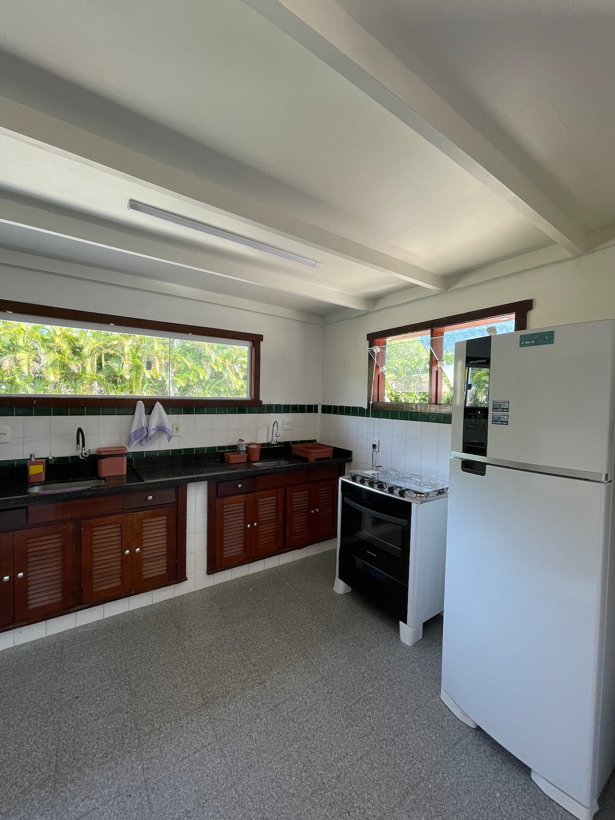 Beautiful house, simple, rustic, alternative style, within a condominium surrounded by beaches and greenery. 3 small en-suites with air-conditioning, 1 mezzanine with air-conditioning. American kitchen. 2 sofa beds. 1 social bathroom. 2 decks, leisure area with lawn, swimming pool, barbecue, pool table, wood-burning oven and ocean view. It is 200 meters from 3 beaches: Biscaia, Baleia (within the condominium) and Tartaruga. All with crystal clear waters. Suitable for simple people who like nature and can enjoy great value for money...