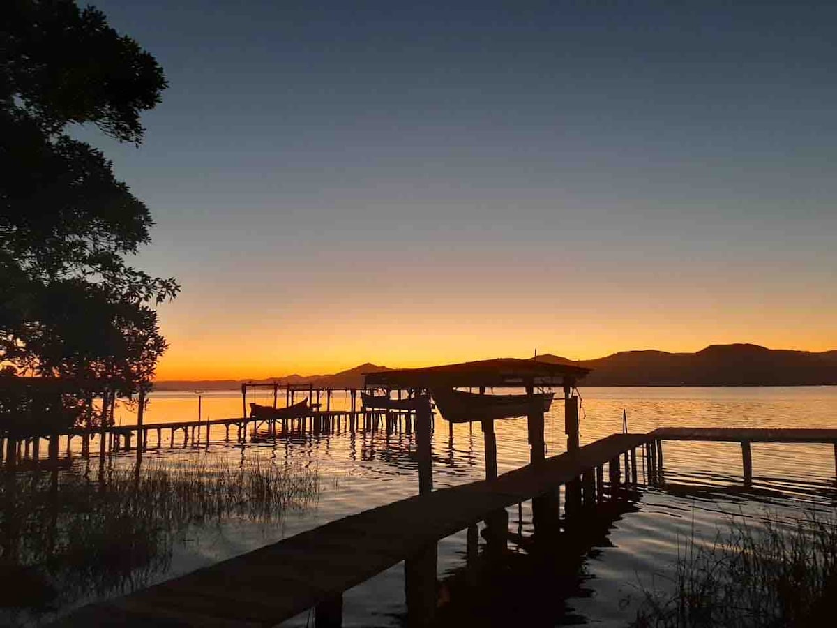 Buscando um refúgio tranquilo p reunir a família ou os amigos? Nossa casa na Lagoa de Imaruí é o lugar perfeito! Com espaço para até 10 pessoas, ela oferece todo o conforto p dias inesquecíveis: lareira, jacuzzi, fogão a lenha, forno de pizza, rampa p jestkis, churrasqueira e caiaque p explorar a lagoa! Ideal p finais de semana, feriados e férias em grupo! Aproveite a natureza, o nascer do sol, o sossego e uma experiência que hotéis não oferecem! NOVIDADE! temos ar condicionado nas duas suítes