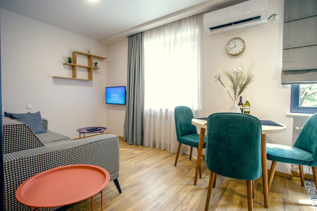 Enjoy a stylish stay from very close to the city center(4 km) NEW apartment on the 1st floor with terrace and green beautiful garden view. The guest will find fully furnished, well illuminated apartments, with all amenities guest might need for a short stay or a long sojourn! The space is equipped with fridge, kettle, handmade (by me)) nature wooden accessories and all necessary amenities for comfortable stay) FREE Airport transfer from Kutaisi Airport can be done if you book 5 or more days!