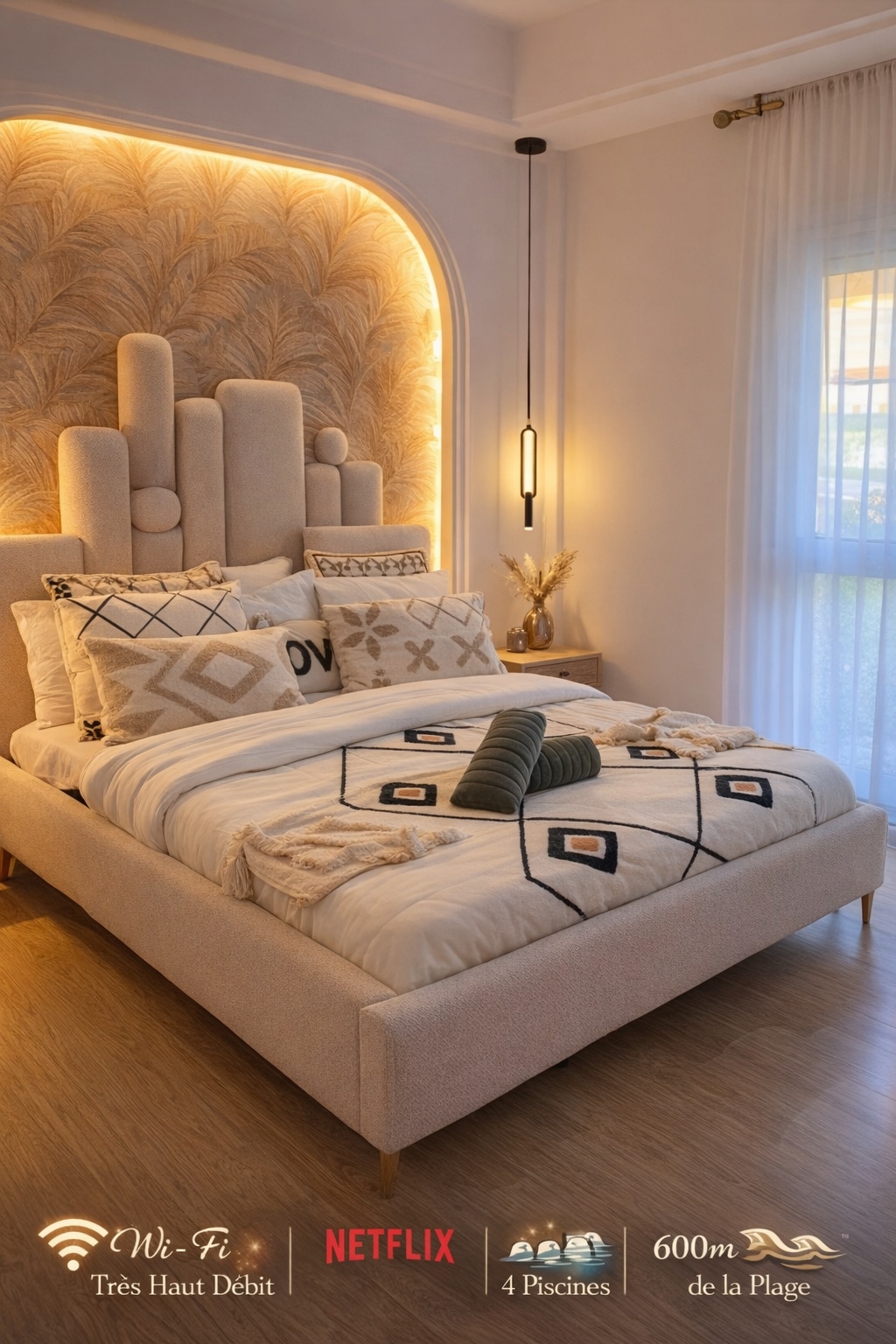 Forget your worries in this spacious and serene space. Enjoy good times with the family. With an unobstructed view of the Imi Ouaddar Valley, savor the meeting of the Arganier Mountains and experience sunset moments on the Atlantic Ocean from your room. Have a good time in the pool, a space dedicated to children, a fitness trail equipped with sports machines to practice your sports activities. a beautiful beach 3 minutes from your residence.