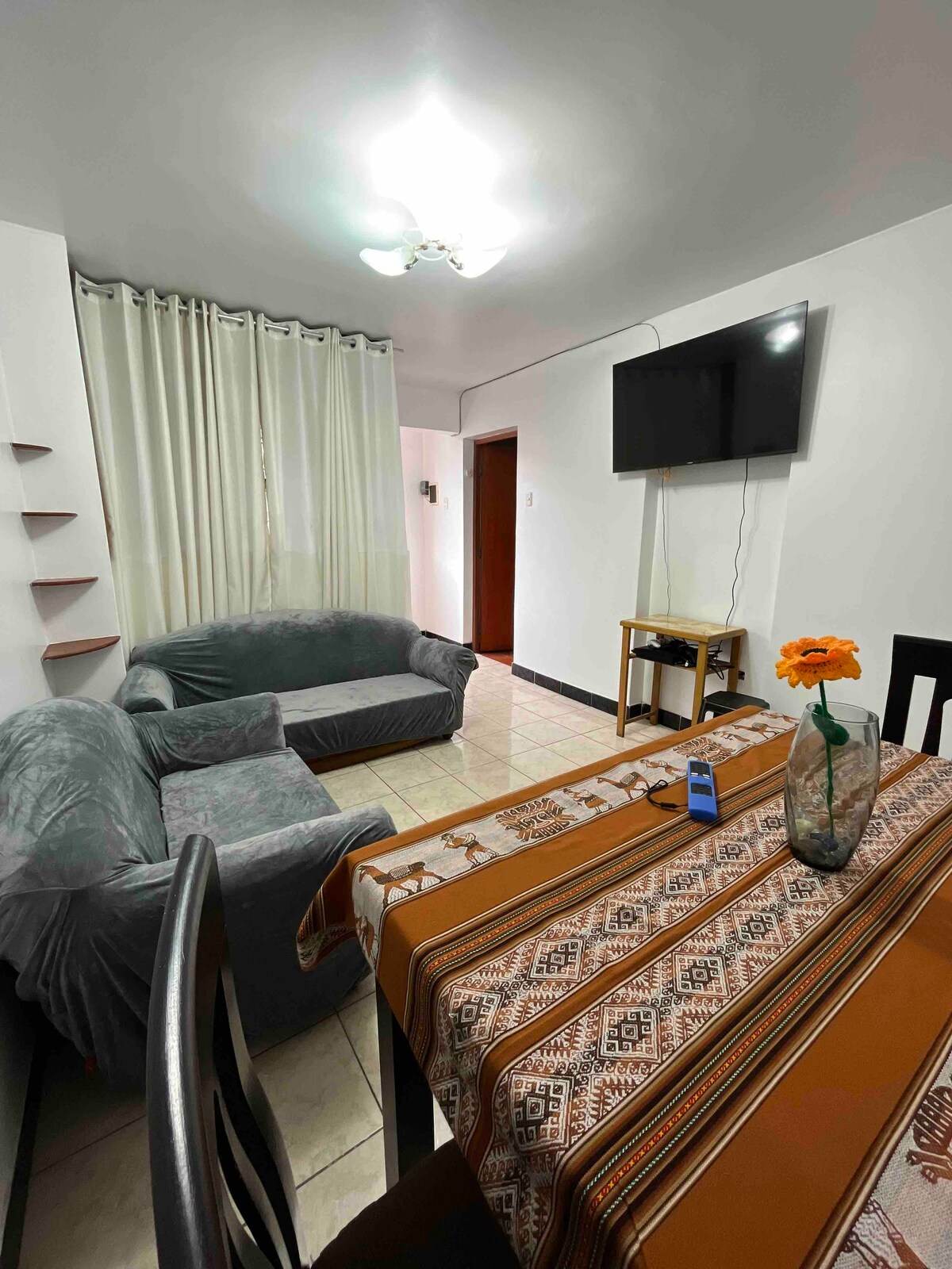Departamento completo NO ES COMPARTIDO (totalmente independiente) tiene 2 niveles (DUPLEX 2do piso y 3ro) que lo hace diferente. En el 1er nivel está la habitación (con cama de dos plazas) y la cocina, en el 2do nivel se encuentra el baño y una habitación con cama de 1 plaza. Hay otra habitación cerrada que podría ser para huespedes adicionales también (si fuera necesario). ES TOTALMENTE INDEPENDIENTE