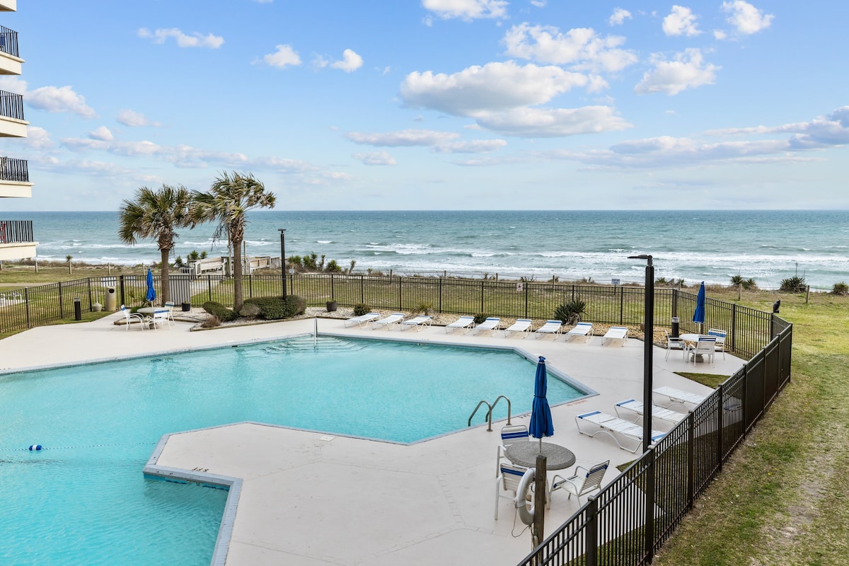Wake up to direct oceanfront views from your private balcony! This stylish beachfront condo features a bright open layout, full kitchen, and cozy bedrooms. Enjoy resort perks including indoor/outdoor pools, hot tub, sauna, and gym—all just steps from the sand. Kid friendly, this condo offers 2 large beds in the guest room & the sports complex with mini-arcade provides fun no matter the weather! This unit is just off the elevator for ease of access. Off-season monthly rentals also available.