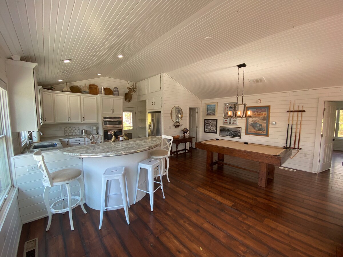 Escape to a private retreat on the White River in Indianapolis! This custom-built home offers a peaceful, open-concept space with a stone fireplace, pool table, and jetted tub. Enjoy 12 acres of shared grounds with river access, kayaks, and fire pits. Perfect for a unique getaway, feeling worlds away yet close to everything. Ideal for couples or small groups seeking tranquility and adventure.