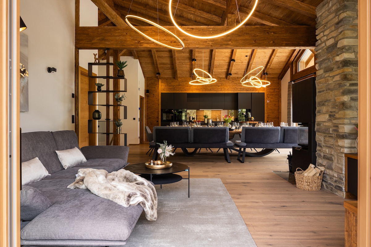 The new and modern luxury chalet for twelve people blends harmoniously into the alpine landscape. Five exclusive bedrooms, each with en suite bathrooms, offer optimal privacy for enjoying your vacation. The communal living area features a modern high-end kitchen and a four-meter solid wood dining table, where you can gather, eat, drink, chat, and enjoy your time together. HIGHLIGHT: Hochkönig Card (includes free mountain lifts and hiking buses during the summer season).