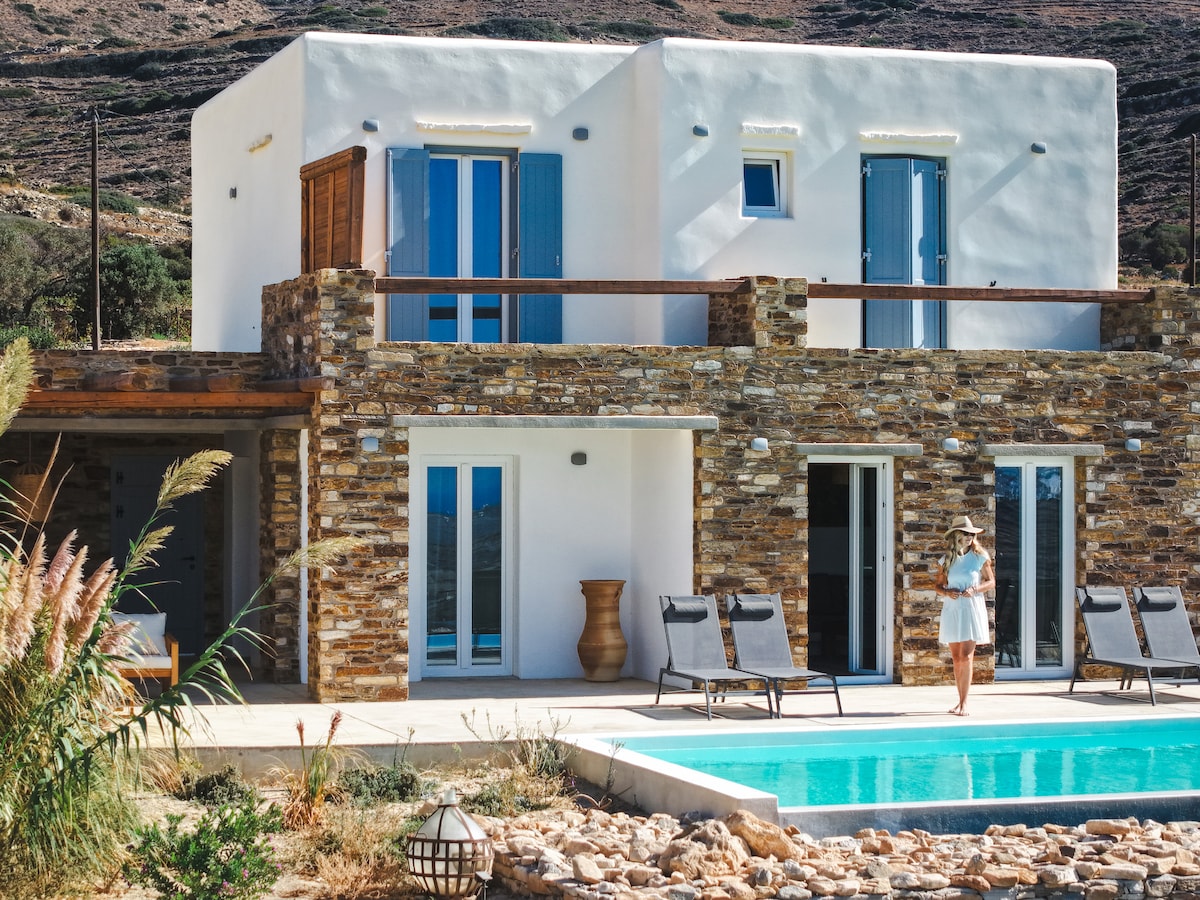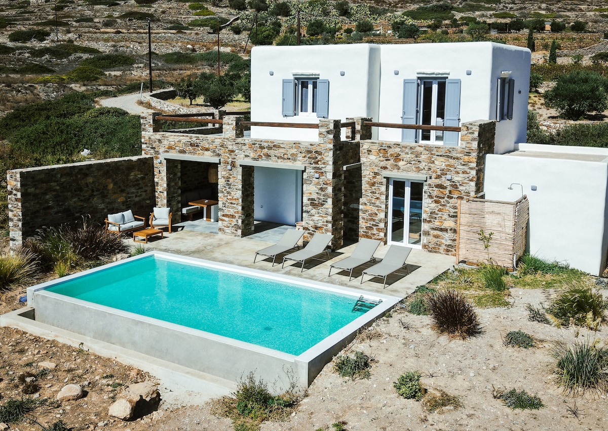 Sea and sun is a brand new house built on the side of the mountain. Only one kilometer away from the most famous beach on the island Mylopotas beach(car or motor bike required- dirt road). With two bedrooms, two bathrooms,kitchen, a living room and an outdoor pool. The sea and the sun are scattered throughout all the rooms of the house. Enjoy the magnificent sunset, the serenity of the sea and discover the beauty at the narrow streets of Ios! We offer special prices for two people!