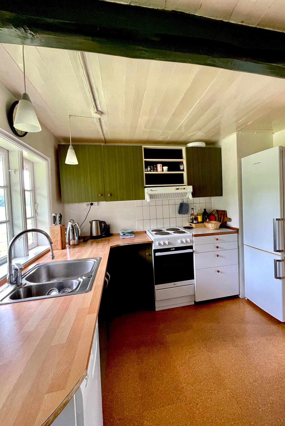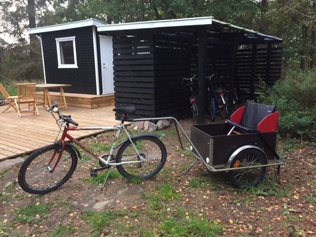 Kjelds house is a small recently renovated resort with dining kitchen, wood stove, living room and niche with a double bed. A modern flush toilet, outdoor bath house, bunk room with 2 beds have separate entrances. There are free bikes available and a large terrace with nice shelter connects all buildings. At the edge of a clearing on the large forest and wilderness plot is a small campfire site. Here you can enjoy the sunset and with a little luck see deer and birds of prey.