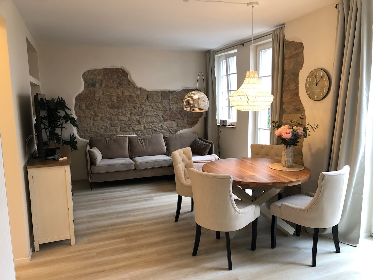 In front of our listed house from 1724, located in the heart of the old wine village of Hambach, the fountain of the church square splashes, overshadowed by the old chestnut tree. Directly behind it the vineyards offer a fantastic view over the Rhine valley. We are happy to open our bright, charming apartment, equipped with every modern comfort, for anyone who wants to explore the Palatinate. We offer a delicious breakfast with homemade products separately.