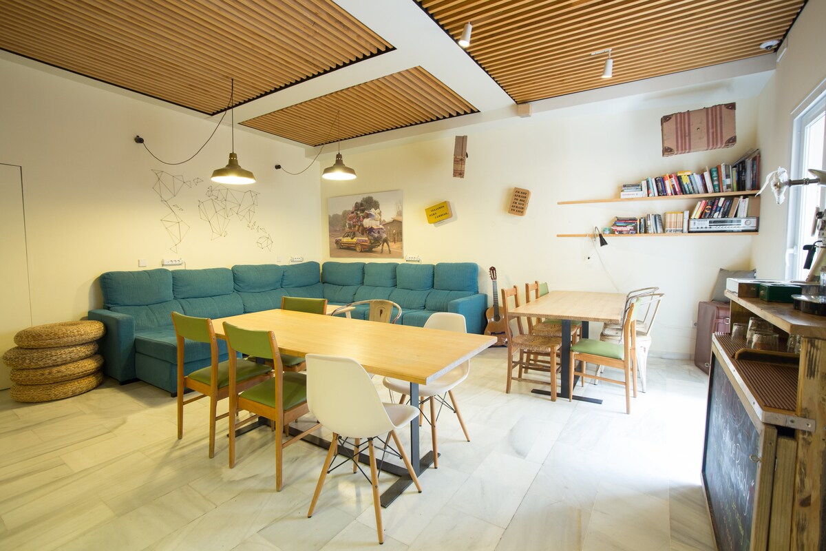 A hostel located in the heart of Seville. Created by and for travelers who want to enjoy a unique experience. You will have access to the kitchen, terrace and dining room. Places to relax and share experiences with other guests. We have several bathrooms on the same floor as the room, laundry service, lockers, air conditioning, high-speed WiFi, information and sale of tourist activities, among many others. Feel free to ask us for more information!