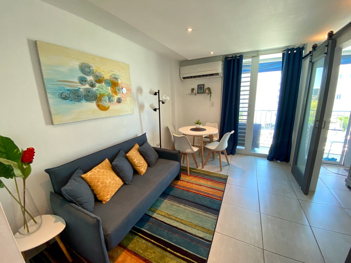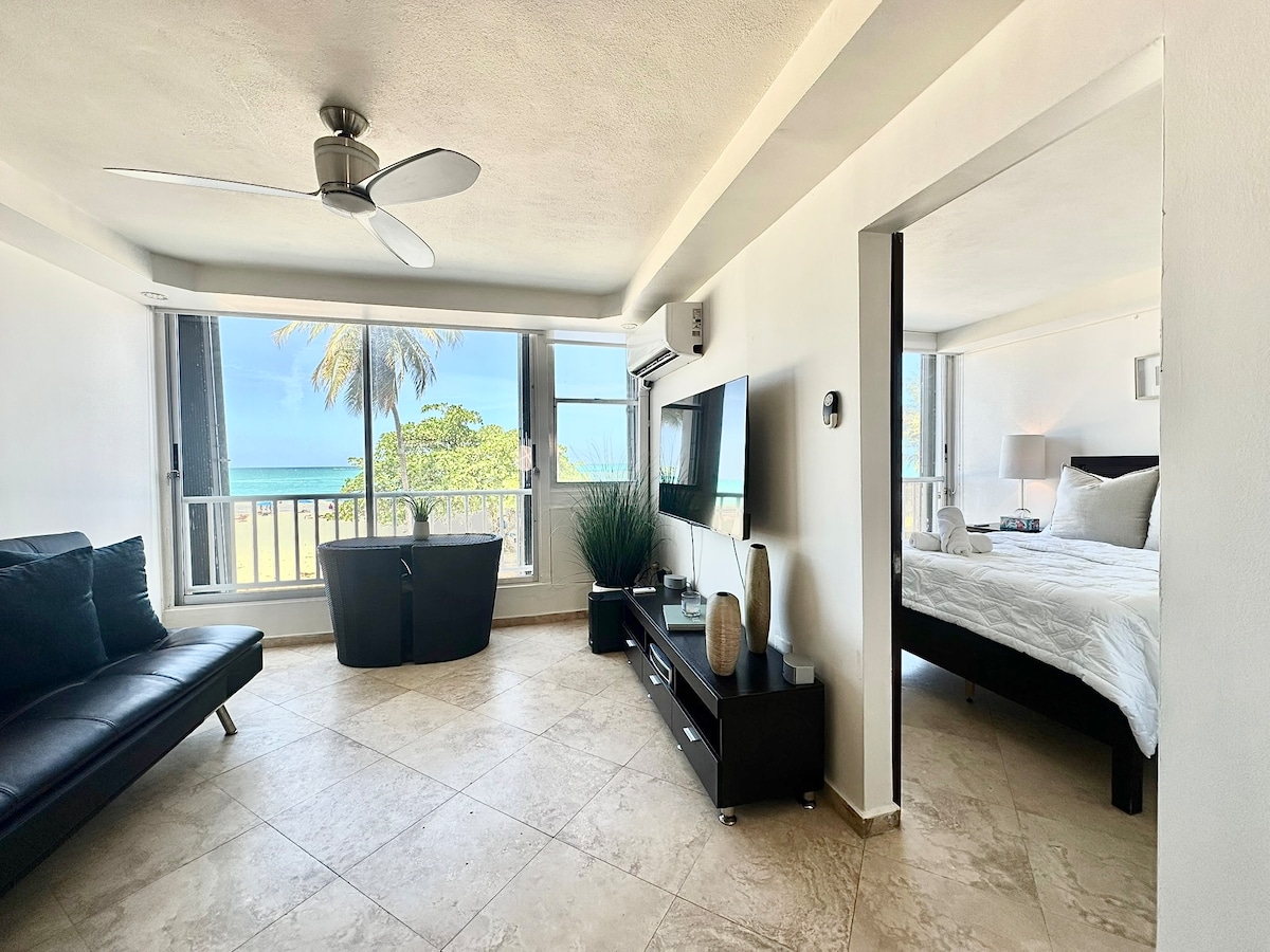 Beautiful studio steps from the beach with ocean view balcony. Equipped with 1 queen size bed with a/c, 1 bathroom, a confortable living area with sofa bed, 32” TV, full kitchen with utensils, private pool for apartment guests and laundry in main lobby. Located in the “Best Urban Beach” on the world according to Caribean Business news. Just across the street you have a CVS, car rentals, and a variety of restaurants. 5 min ride from the airport and 7-10 min ride to Old San Juan and Condado.