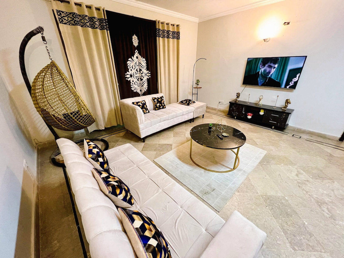 No other rental beats this lavish, Centrally located, secure & immersed in serenity beautifully designed & tastefully furnished independent 3 bedrooms residence with private entrance & parking for families, business travelers & anyone looking for a Royal luxury Home @ Central Location. Soak up the modern & vintage charm of this Royal brand new villa. Extraordinarily lavish designer furnishing, spacious rooms, greenery, spectacular views & workplace. Large beautiful garden to host gatherings.