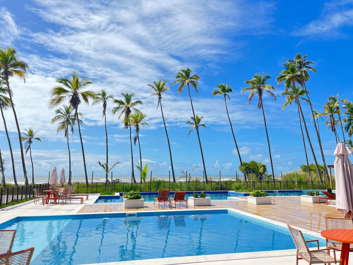 In front of a beautiful beach. A condominium at the foot of the sand and with access to the beach. - Pools combined with a deck. - Beach with kiosk located a 5-minute walk away. - Apartment with air-conditioning in the en-suite, bedroom and living room. - All furniture and fine finishes of the highest quality. - Apartment with a sea view. Come and enjoy this condominium paradise. PS: A maximum of 6 Adult guests are allowed. Location: After the Tororomba and Canabrava Resorts.