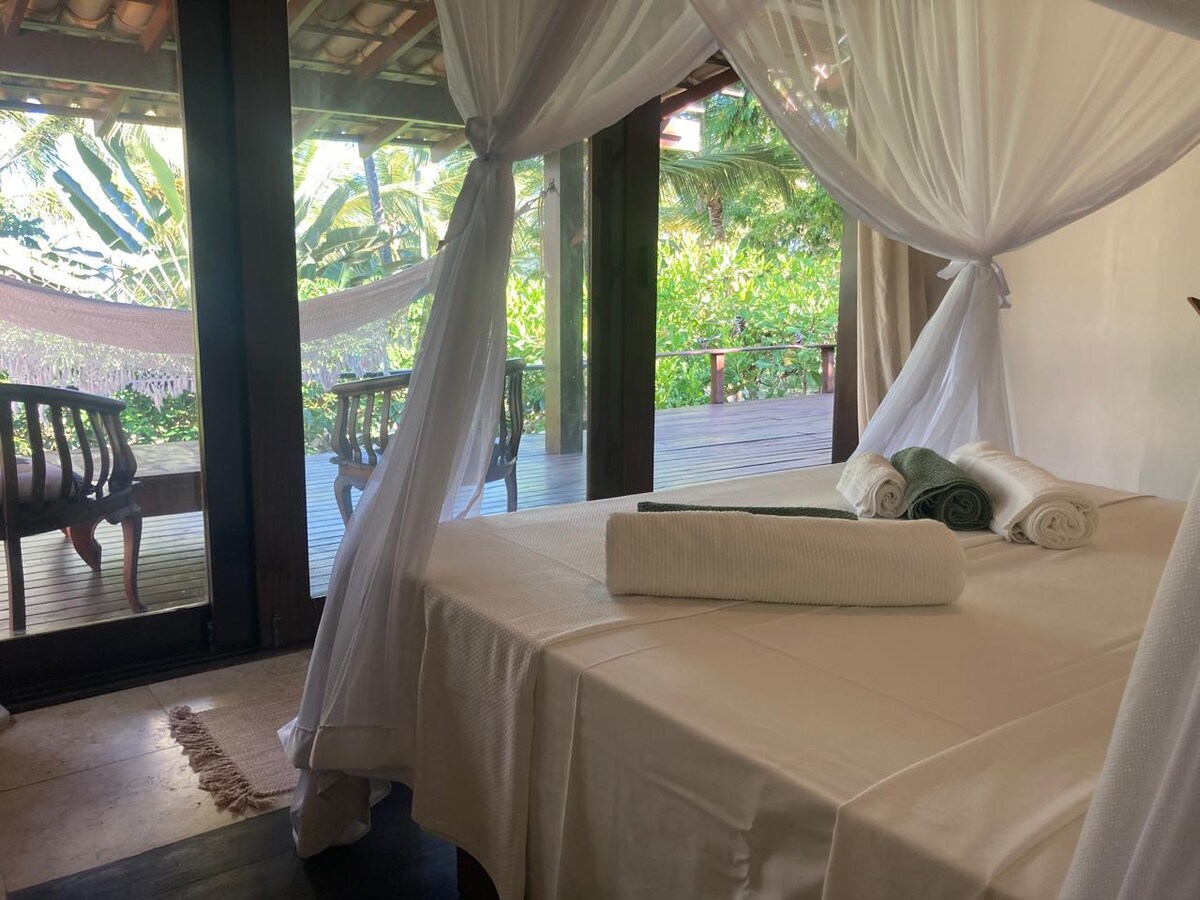 Have fun with the whole family in this stylish place. Bungalow with beach decor, located 5 km from downtown Itacaré, close to the best beaches. Quiet, sophisticated, cozy, safe environment, space with garden, lawn, well wooded, with visits from various species of birds. Complete bungalow with fully equipped kitchen, 1 king size bed and a super comfortable sofa bed for 2 people. The experience your family is looking for with tranquility, in a Bahian paradise called Itacaré