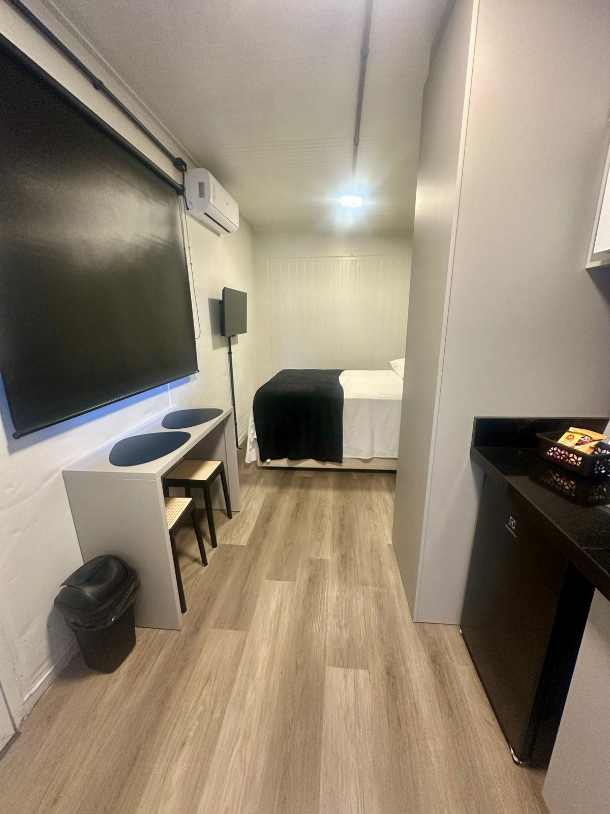 Kitnet for 3 people made in refrigerated container (with THERMAL INSULATION like a common house) 1 double bed and 1 single auxiliary GROUND FLOOR With rotating parking space and 120mb Wi-Fi Internet Ideal for those who want to enjoy the city to the fullest and save money on their stay 1000 meters from the central beach. Quiet street with nearby shops and easy access to the main avenue and Praia Brava. ****each white door in the photos corresponds to a studio apartment. There are 6 in all.