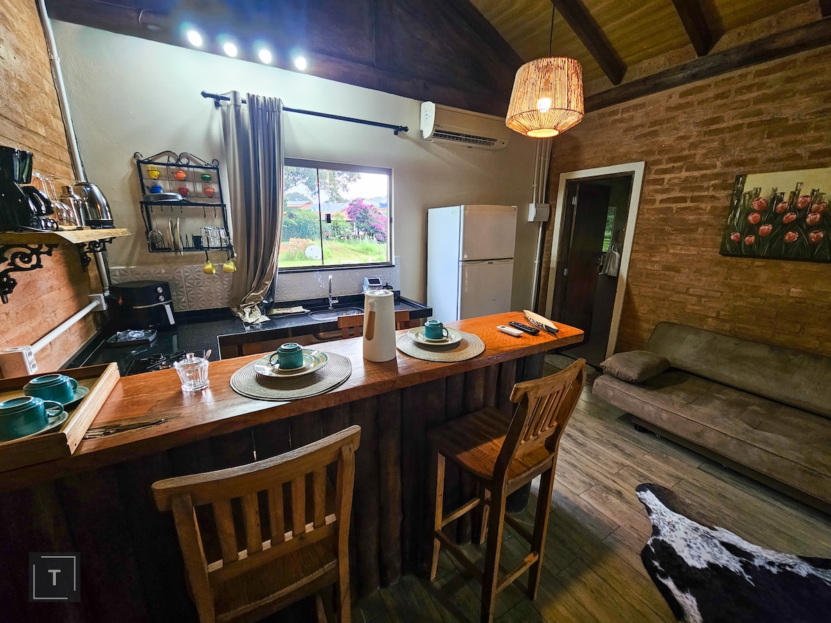 Rustic wooden cabin, furnished in a simple and cozy way, for a pleasant experience in the mountains. Loft type, with a bedroom, open kitchen, bathroom and balcony. It has a barbecue area, a place for a bonfire, and an incredible landscape! Available for Couple, with the possibility of + 1 additional mattress (single, on the floor / NO BED). The rent already includes bed and bath linens, and the kitchen is basically equipped, with a minibar, stove, electric oven, coffee maker and utensils...