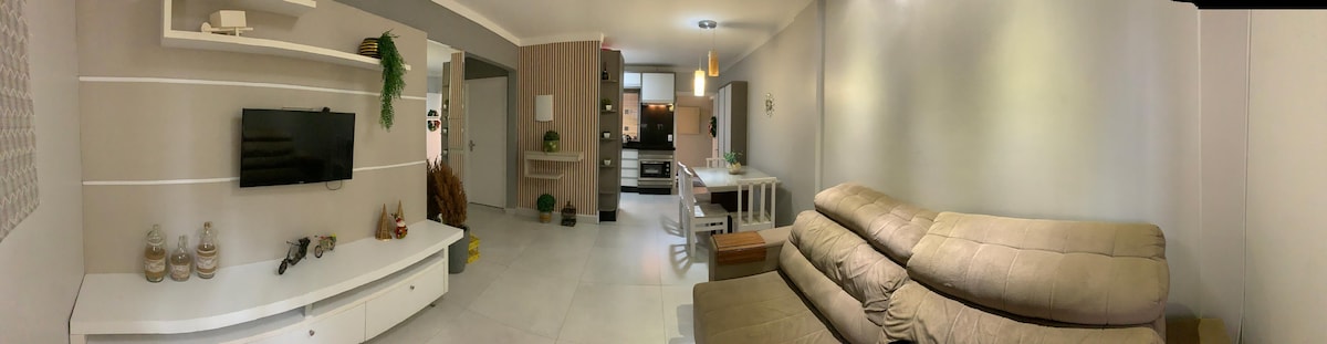 Obs: Não fornecemos toalhas de banho. Melhor custo benefício! Churrasqueira a carvão. Perto da praia do Centro, mercado Koch na esquina. Condomínio fechado com pracinha e infraestrutura para a família! Em condomínio familiar com portaria 24h. 6 min da praia central de carro e 15 min a pé. A acomodação Churrasqueira, Apto com 2 quartos (1 casal e 1 casal), ar cond. em um dos quartos e na sala, 1 ventilador, sofá grande, cozinha equipada, sacada, wifi, TV. Não possui maquina lava roupa.