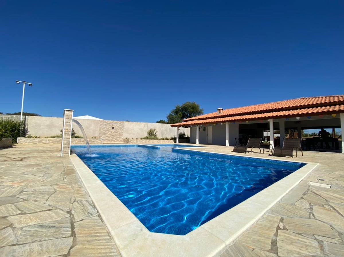 This stylish home is perfect for group travel. It is inside a condominium where there is greater security and no noise problem. The space is 1,000 meters: *SWISS CHALET, with 1 bedroom, living room, kitchen and bathroom. * MULTI-USE HALL WITH 100 meters. * 4 BEDROOMS, EACH WITH 1 DOUBLE BED AND 1 BUNK BED. * LARGE POOL MEASURING 12X4 METERS * BARBECUE GRILL * WOOD-BURNING STOVE * PIZZA OVEN * FIREPLACE AREA * 2 OUTDOOR BATHROOMS * SOCCER FIELD * ACCOMMODATES 20 PEOPLE.