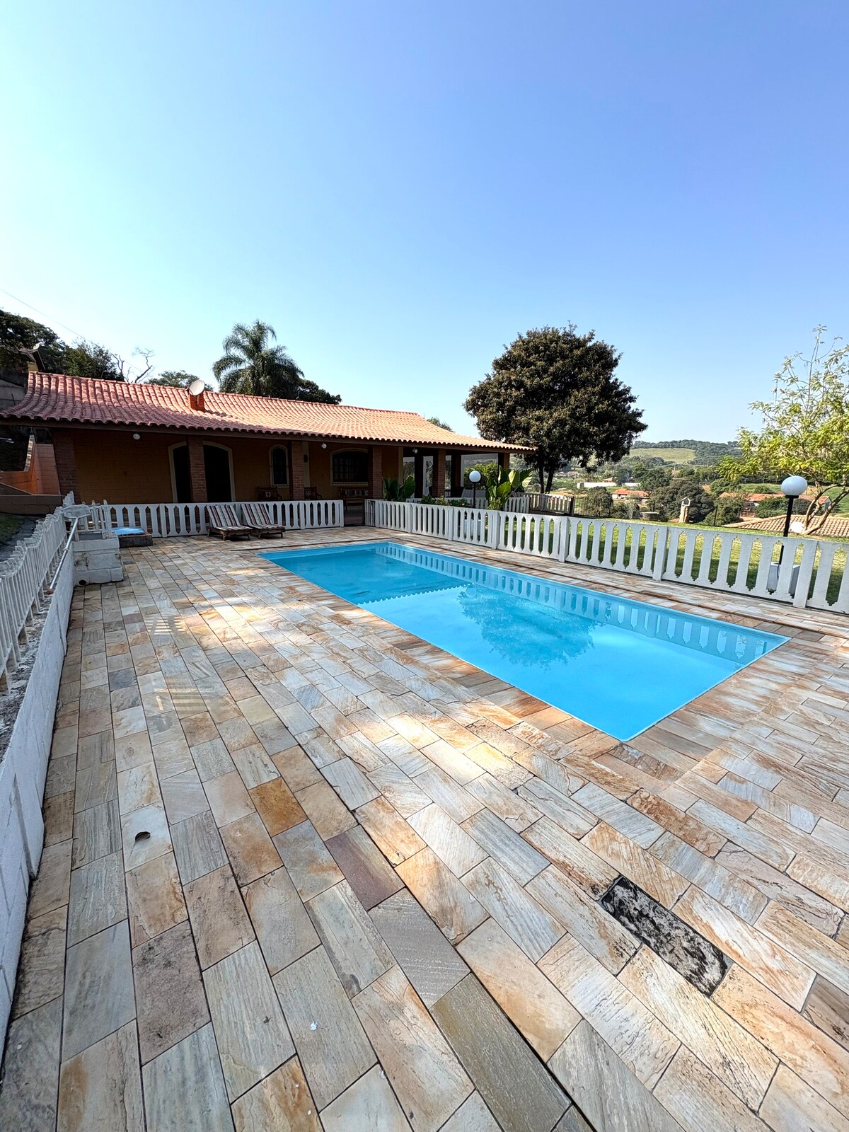 🌿 Enjoy a cozy farmhouse with a green lawn that seems to have no end — the perfect setting to relax while the sun sets 🌅. Dive into the refreshing pool 🏊♂️ or prepare that tasty barbecue to enjoy outdoors 🍖🔥. When night comes, light the fire, feel the warmth and enjoy the peace of the place🔥✨. 🚪 The entrance is totally exclusive, with no shared spaces, ensuring all the privacy you deserve 🙌🔒!