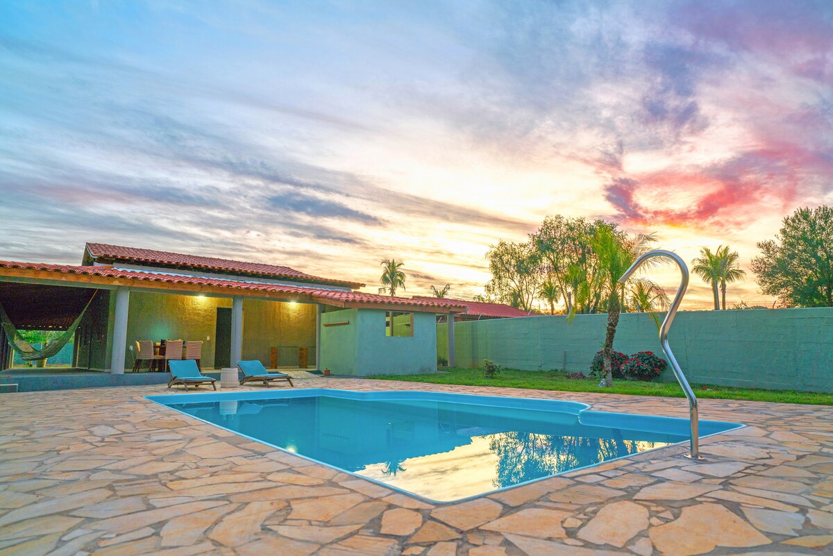 Relaxe neste espaço calmo e cheio de estilo. Terreno totalmente cercado, ideal para deixar seus pets livres. Sempre bom lembrar que vc estará num ambiente semi rural onde as comodidades da cidade podem sofrer alterações como falta de energia/internet, não é comum mas podem oscilar. Há muitos pássaros,saguis,frutas,horta natural. Muita área livre e piscina estruturada, 7mil lts. Espaços para conversar, redes e churrasco, fogueira . A casa é simples e cheia de charme informal.
