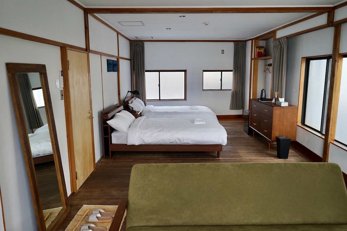 Sea view double room, free private hot spring by appointment, 10 min walk to bus station, 20 min walk to tram station, 10 min drive to Mt. Omuro